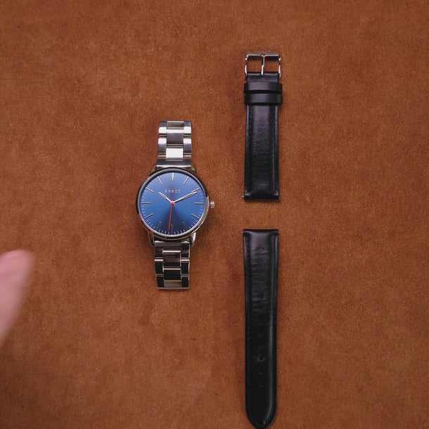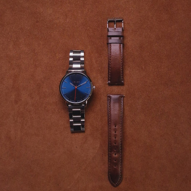 El azul persa del dial y el segundero naranja crean un contraste que no pasa desapercibido. El brillo del plateado pulido se combina con la elegancia del cuero para darte dos estilos en un solo movimiento. Distinción atemporal y versatilidad listas para cualquier ocasión.