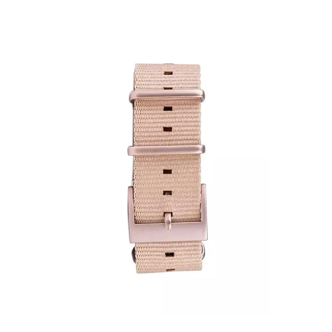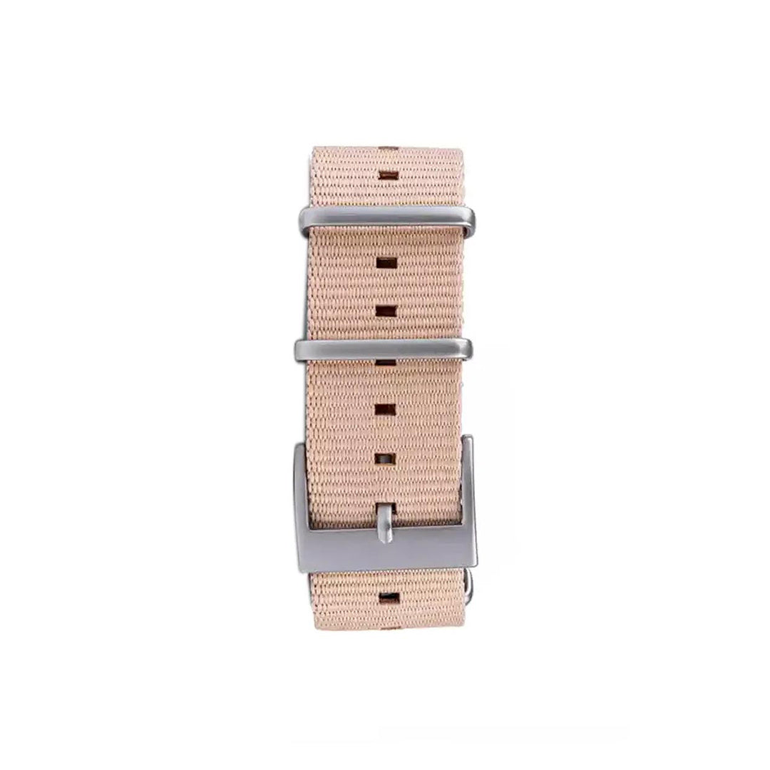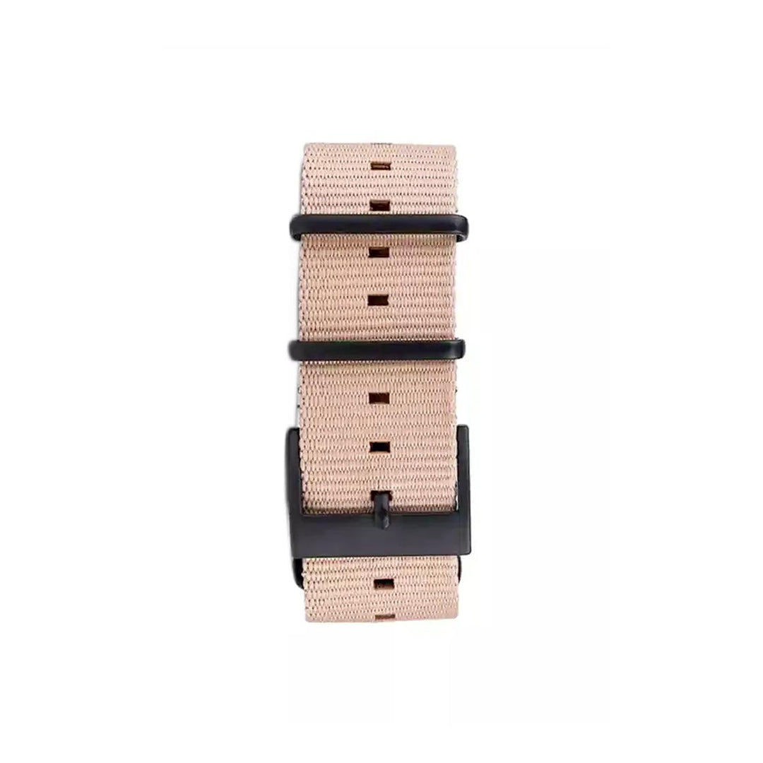 Correa Nato de nylon de 22mm, en un sofisticado tono beige Atacama. Su diseño ligero y resistente es ideal para un estilo casual y deportivo, permitiéndote lucir bien mientras disfrutas de tus actividades al aire libre. Tiene un sistema de correa intercambiable te permite personalizar tu reloj al instante.