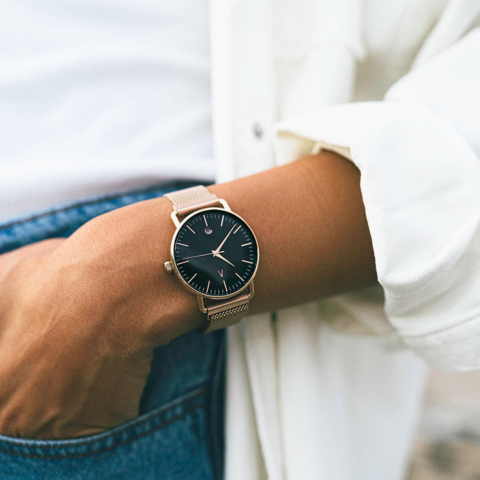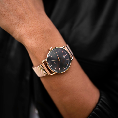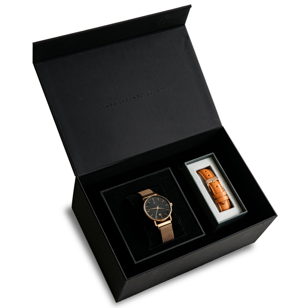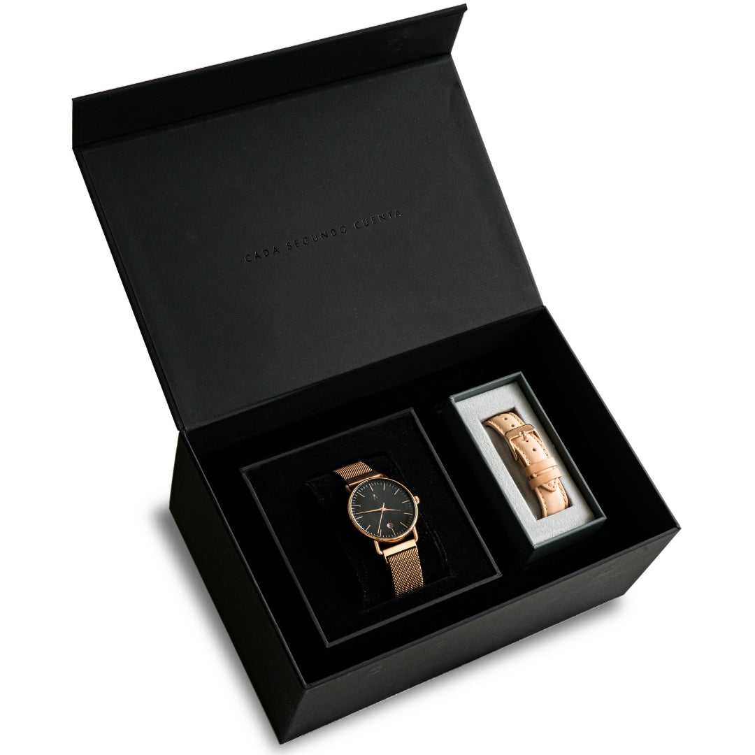 El Juana Mesh es el reloj que fusiona elegancia y actitud. Su diseño minimalista en tonos cobre y negro resalta la sofisticación en cada detalle. Ideal para quienes buscan un accesorio que hable de fuerza sin perder refinamiento.