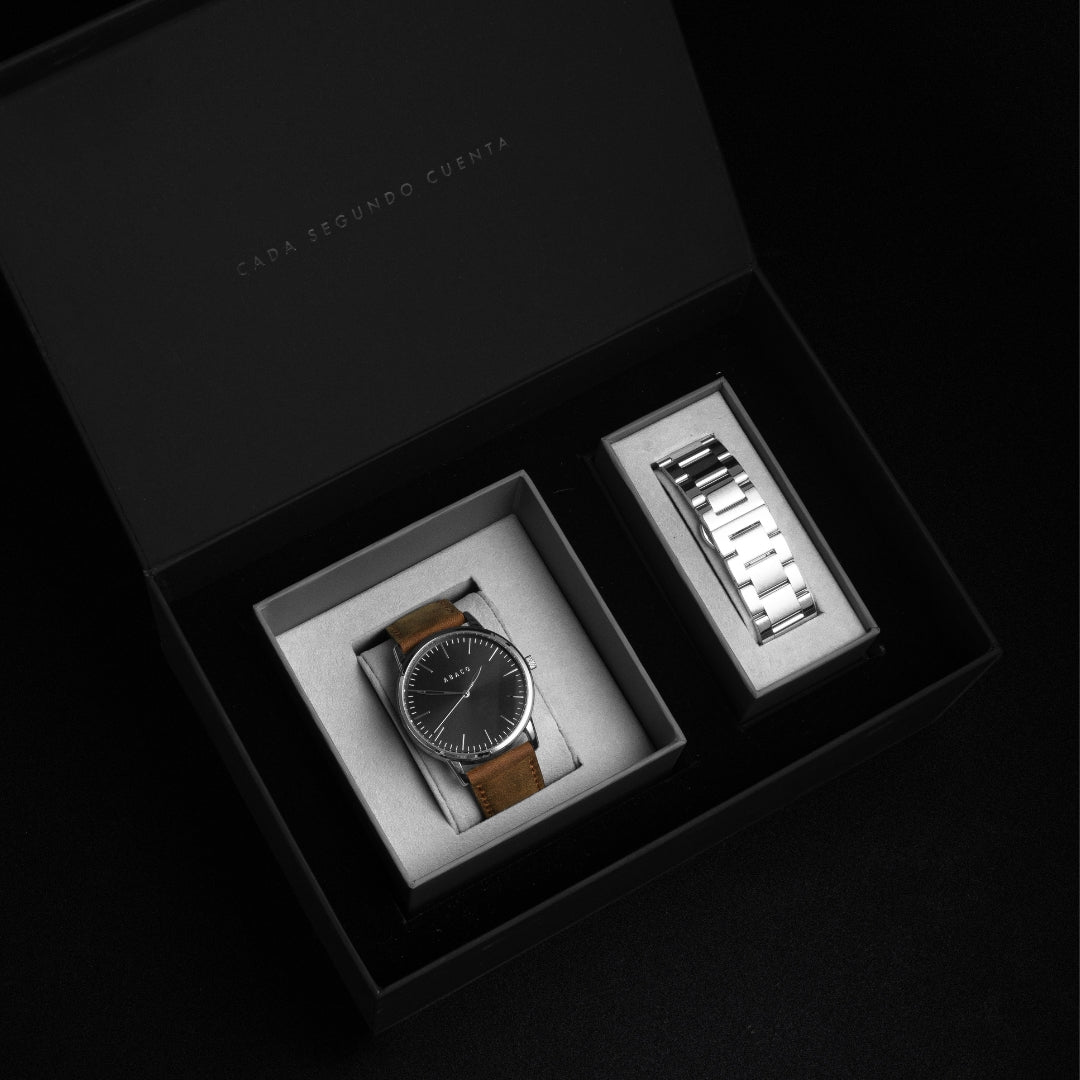 Incluye: Reloj Darwin con brazalete de acero + correa de cuero adicional.