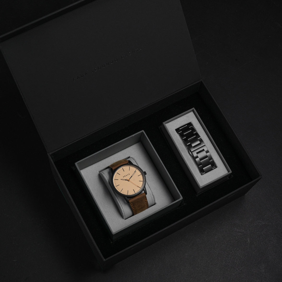 Presentación de regalo en gift box con reloj Tesla y correa adicional de cuero | Ábaco Presentación de regalo en gift box con reloj Tesla y correa adicional de cuero | Ábaco